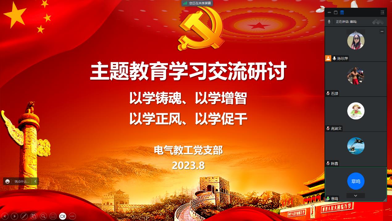 范松丽和陈鑫同志分别领学了“以学铸魂,坚定理想信念”和“以学增智,提升思维能力”。支部党员同志结合“以学正风、以学促干”展开热烈的交流讨论,从自身角度交流了如何在教学科研上“兴务实之风、扬清廉之风、养俭朴之风”。付保川、许洪华等同志进一步就支部所在电气工程及其自动化、建筑电气与智能化等两个专业建设,电子信息下设控制工程学位点建设以及智能科学与技术学术型硕士点的申请工作进行了谋划。大家纷纷表示要进一步深入加强主题教育学习,要“从党的科学理论中悟规律、明方向、学方法、增智慧”,高质量完成专业建设和学科建设任务,提升人才培养质量。