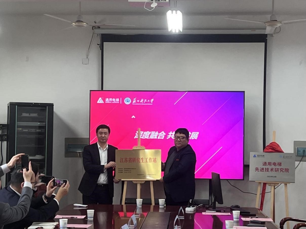 交流会后,肖校长和徐董事长共同为通用电梯先进技术研究院揭牌,陈丰副院长和顾月江总经理共同为苏科大通用电梯研究生工作站授牌。
