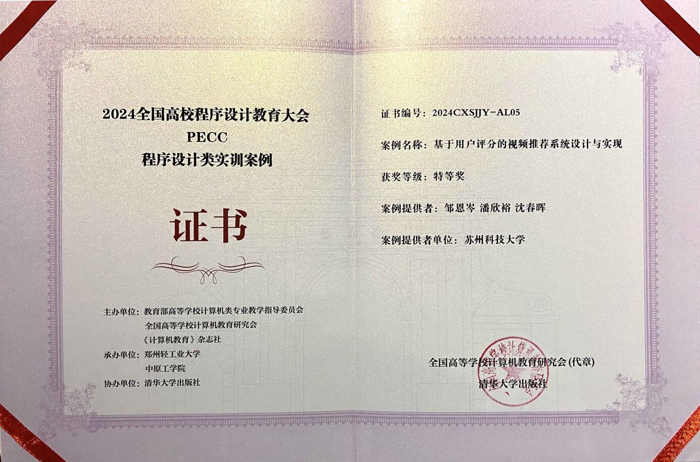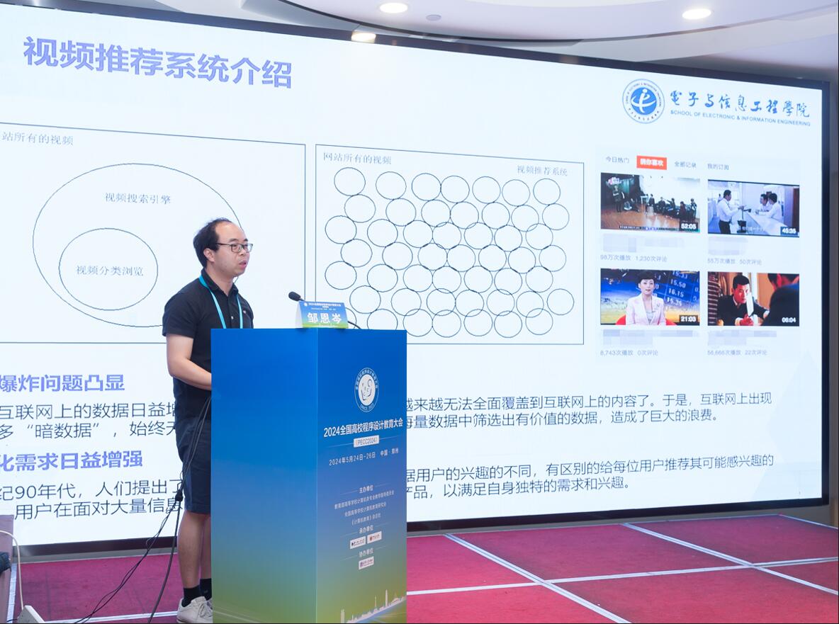 教师团队——邹恩岑、潘欣裕和沈春晖老师凭借精心设计的《基于用户评分的视频推荐系统设计与实现》程序设计课程实训案例,荣获全国特等奖并受邀至大会进行现场报告。