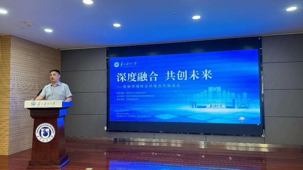 8月30日,在苏州市工业和信息化局指导下,由苏州市信息技术应用创新联合会主办和苏州科技大学承办的“深度融合 共创未来”信创领域校企对接合作座谈会在苏州科技大学(石湖校区)图书馆8楼会议室召开。来自苏州大学、苏州职业大学等13所高校信创领域的专家教授、研究学者以及23家信创领域的企业代表共60余人参加了此次会议。