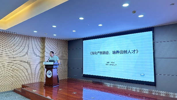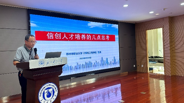 会上,高校代表苏州科技大学祝勇俊和苏州职业大学曾海分别做了《繁荣信创生态,助力信创产业》、《信创领域技术技能型人才培养的几点思考》主题分享;企业代表中国软件评测中心倪银芳和江苏天创科技有限公司张洪璇也分别做了《工信部重点实验室高校课题合作经验分享》、《深化产教融合,培养信创人才》主题分享。