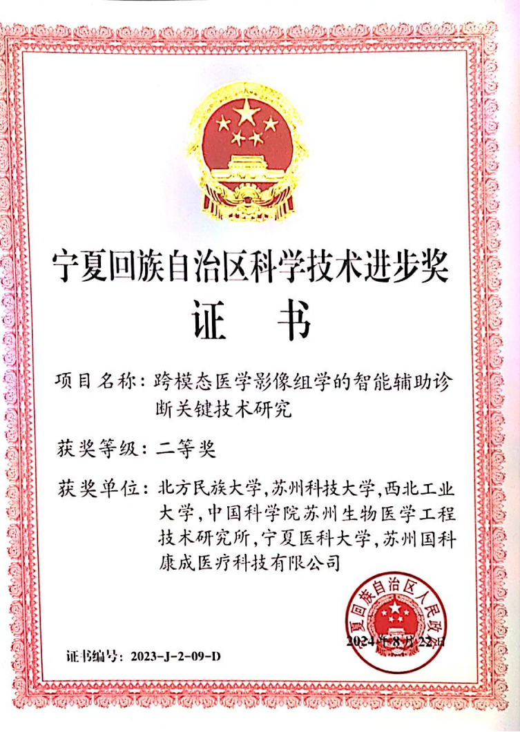 近日,2023年度宁夏回族自治区科学技术进步奖揭晓,由北方民族大学牵头,开云体育为第二完成单位、胡伏原教授为第三完成人参与申报的成果《跨模态医学影像组学的智能辅助诊断关键技术研究》荣获二等奖。据悉,2023年中宁夏回族自治区科学技术进步奖125项(其中一等奖9项、二等奖38项,三等奖78项),自然科学奖33项,技术发明奖2项和技术合作奖2人。