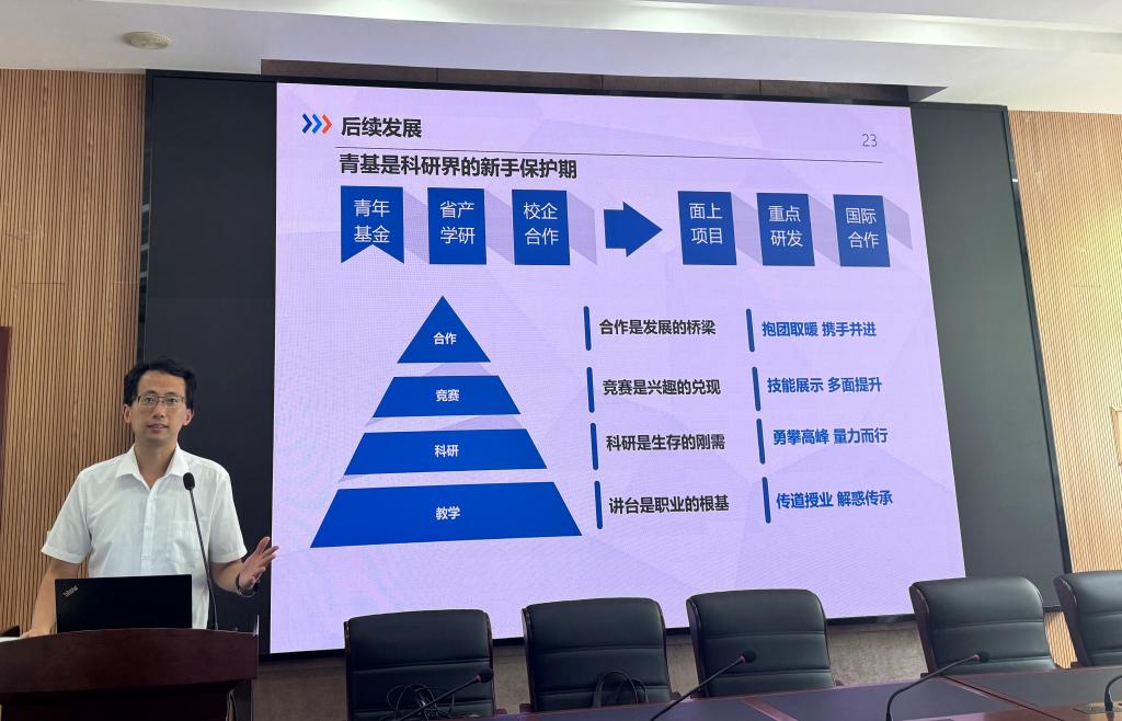 会上,青年教师丁戍辰聚焦“国家自然科学基金青年基金申请与教师职业发展”展开专题分享。他结合个人申请历程,详细讲述了实践心得,并围绕获批后科研路径规划、教学能力提升、学生竞赛指导及学术合作交流等方面总结经验,为青年教师的职业发展提供了切实参考。