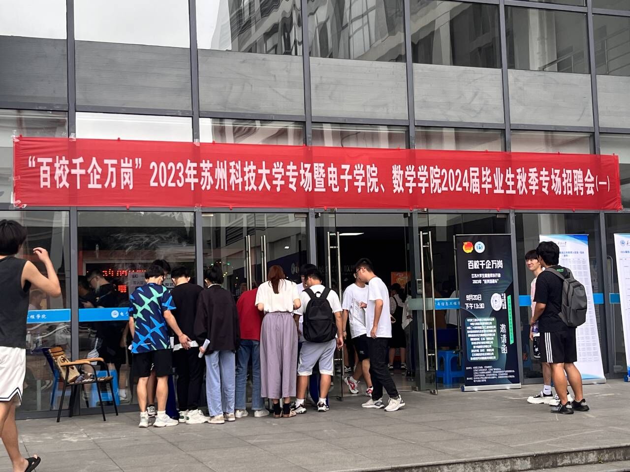 于电子楼大厅举办了“百校千企万岗”2023年大学生就业帮扶行动“送岗直通车”苏州科技大学专场招聘会,此次招聘会共邀请到50余家企业,提供近1000个岗位,共吸引800余名毕业生参加。