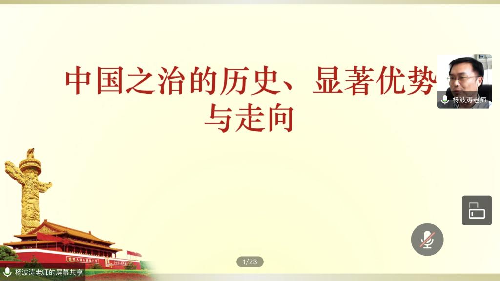 5月20日,副书记兼副院长杨波涛以”中国之治的历史、显著优势与走向“为主题,为2017级计算机和电气系近150名学生上了一堂生动的思政课。授课中,杨书记从中国之治的内涵与意义,中国特色社会主义制度的形成,中国之治的显著优势和中国之治的走向4个方面,通过大量事实和图片资料带领同学们了解中国之治。