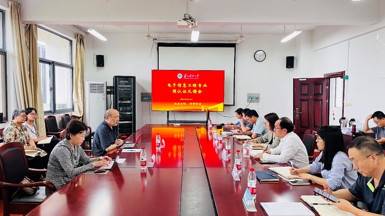领导、电子信息工程专业系主任、骨干教师、辅导员等参加了会议,见面会由教务处处长段姝主持,陈鹤鸣教授做为考查组组长主持预认证现场考查工作,系主任班建民就自评自建成效进行了专业自评报告补充说明。