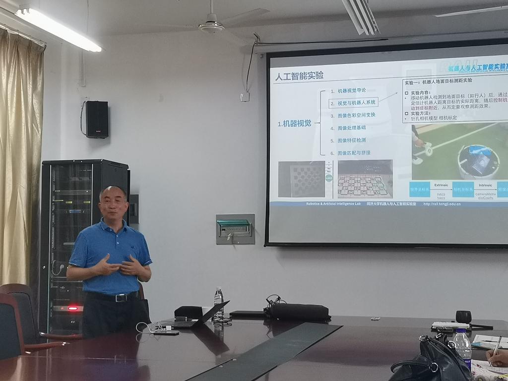 陈启军教授首先介绍了同济大学人工智能新专业的申请设立过程以及学科建设、课程改革和课程优化的情况。随后,从创新人才培养特色方面介绍了学生创新创业实践方面的宝贵经验。陈教授从移动机器人系统出发,分析了机器人定位与建图、机器人感知和无人系统控制技术等关键问题,最后谈到了无人驾驶技术的最新进展及该团队在该项目中取得的最新进展。与会老师和研究生同陈启军教授就人工智能专业特色、自动驾驶中的环境感知难点、多机协同调度等内容进行了热烈的讨论。