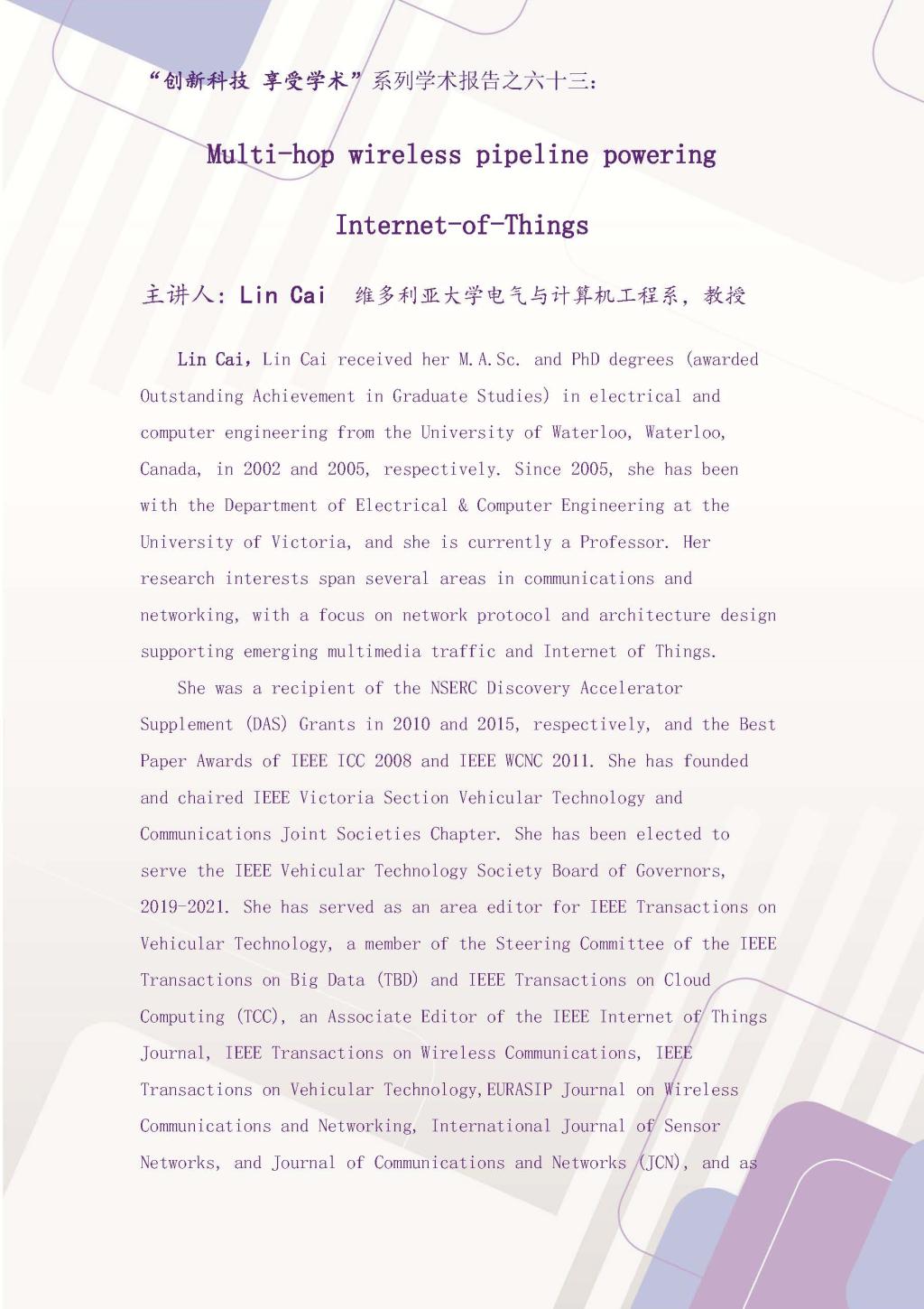 “创新科技 享受学术”系列学术报告之六十三:Multi-hop wireless pipeline powering Internet-of-Things