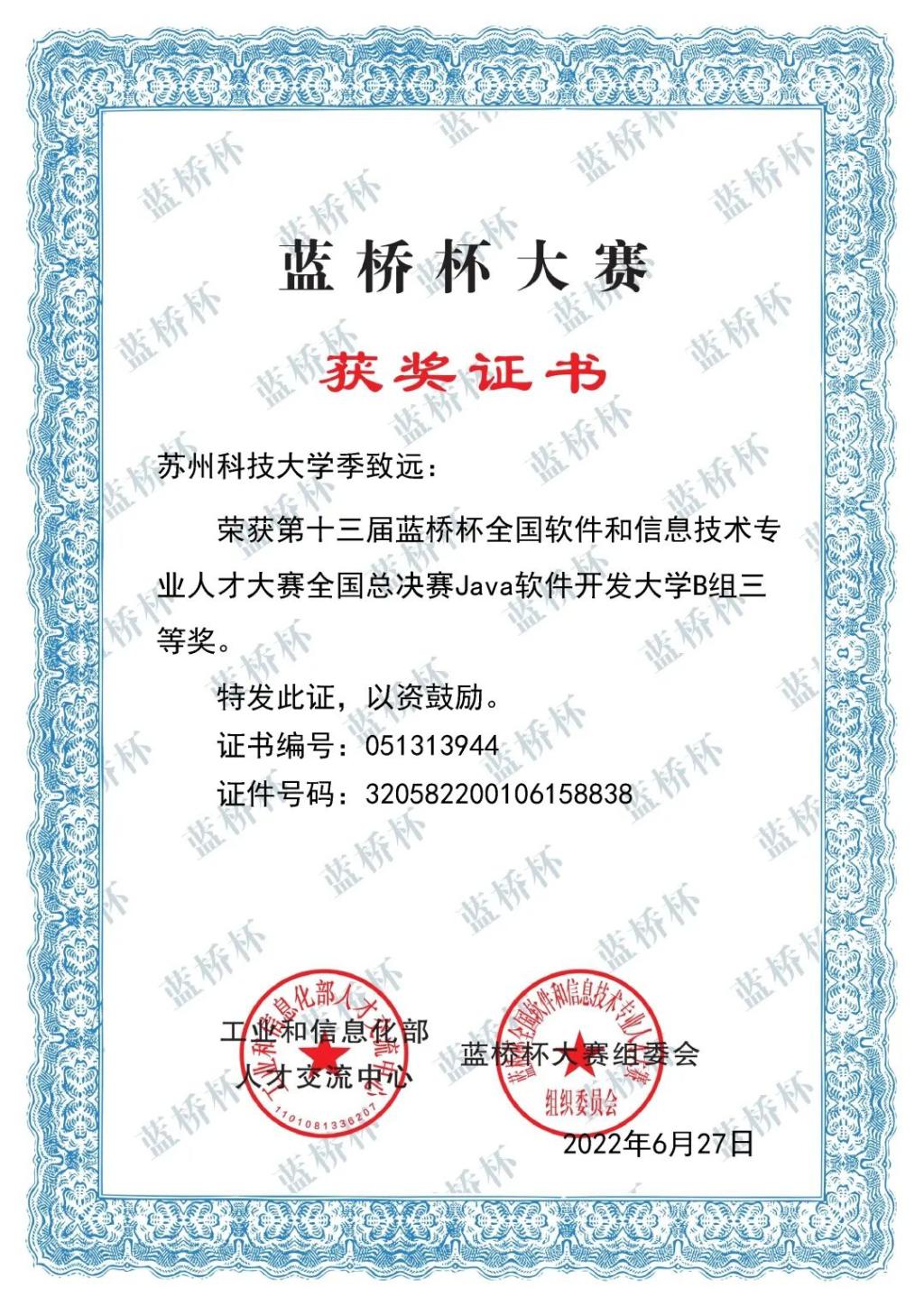 计算机科学与技术专业2019级本科生。连续多次获校特等奖学金,曾获第十三届中国大学生服务外包创新创业大赛企业命题类三等奖、第十三届中国大学生服务外包创新创业大赛万维艾斯-中兴通讯东部区域赛企业命题类(A类)二等奖、第十三届蓝桥杯全国软件和信息技术专业人才大赛全国总决赛Java软件开发大学B组三等奖等奖项。