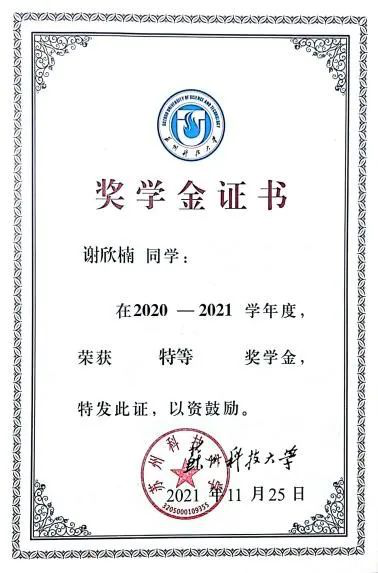 自大一开始,谢欣楠就把身边优秀的学长学姐当作榜样,以他们的事迹为目标,督促自己奋发向上,尽自己最大的可能达到与他们比肩的高度。对于学习,她始终相信努力的意义,相信勤奋刻苦、脚踏实地,终有为之匹配的收获。课堂上她争前坐排,认真听讲,不懂就问,不留疑点;课下及时回顾,整理归纳,博观约取,厚积薄发。长久以来,学业上她全科发展,大二学年16门必修课中,8门课获得了95分以上的成绩,连续两学年绩点4.2,学习成绩和综合测评均专业排名第一。