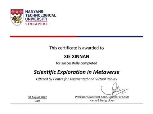除专业学习外,谢欣楠也深知英语的重要性。她从大一入学开始就每天有计划的背单词,跟着语音材料逐词逐句反复跟读练习,直到能脱口而出。为进一步提高英语实际应用能力,在大二暑假她参加了新加坡南洋理工大学元宇宙科研探索的线上交流活动,全英文授课锻炼了她的英文能力,通过交流项目她也了解了专业方向在国际上的发展趋势。