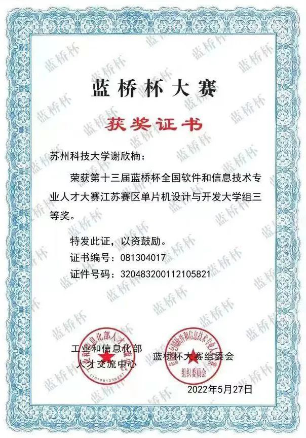 “唯有勇敢突破,方能缔造璀璨”。在导师的指导下,她和小组成员开始着手参加各种专业竞赛。从一无所知的小白,到逐渐入门产生最初的想法,到编程编码,再到成果展现,从无到有的过程无不包含了老师的良苦用心和团队成员的协作努力,最终取得十三届蓝桥杯单片机组省赛三等奖、校数学建模大赛二等奖的好成绩。