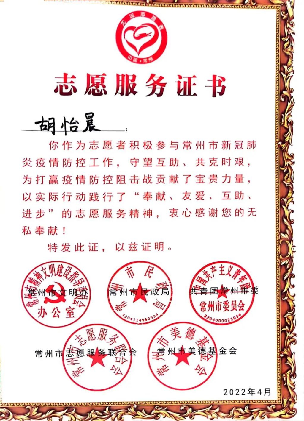 大二上半年居家,新冠疫情仍在扩散,胡怡晨积极报名家乡抗击疫情志愿者服务工作,网课一结束,她就穿上防护服,跟随医疗团队在居民社区和“江苏时代”大型工厂进行抗原检测工作。“我们是充满活力的青年大学生,主动接过时代的接力棒是我们义不容辞的责任!”